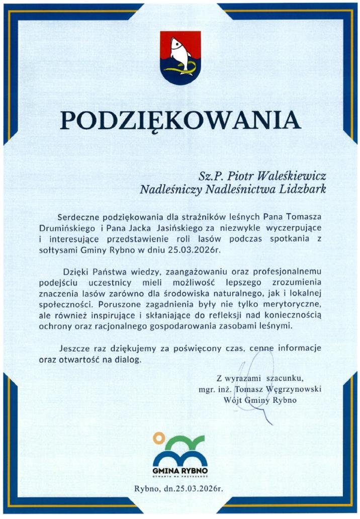 Pan Tomasz Drumiński oraz Pan Jacek Jasiński otrzymali na ręce nadleśniczego podziękowania za realizację spotkania z sołtysami Gminy Rybno dotyczącego roli lasów, współpracy z zakresu szkodnictwa leśnego oraz innych aspektów wielofunkcyjnej gospodarki leśnej.